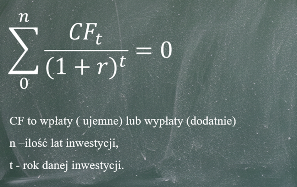 Ten sam wynik można zapisać również za pomocą pierwiastka stopnia n z ilorazu wartości końcowej i początkowej inwestycji, pomniejszonego o 1, gdzie n oznacza liczbę lat trwania inwestycji.