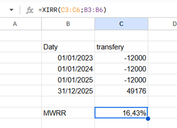W praktyce jednak nikt nie liczy tego ręcznie. Do tego celu służy Excel. Zarówno w Excelu, jak i w Arkuszach Google funkcją służącą do obliczania MWRR jest XIRR, gdzie najpierw podaje się wartości przepływów pieniężnych, a następnie odpowiadające im daty.