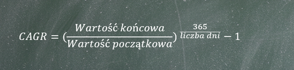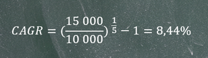 W różnych źródłach finansowych, blogach czy zestawieniach bardzo często spotyka się anglojęzyczny skrót CAGR (Compound Annual Growth Rate). Jest to dokładnie to samo pojęcie, czyli średnioroczna stopa zwrotu. Policzmy więc CAGR dla naszego przykładu. Dysponujemy wszystkimi potrzebnymi danymi: wartością początkową inwestycji, wartością końcową oraz liczbą lat jej trwania.