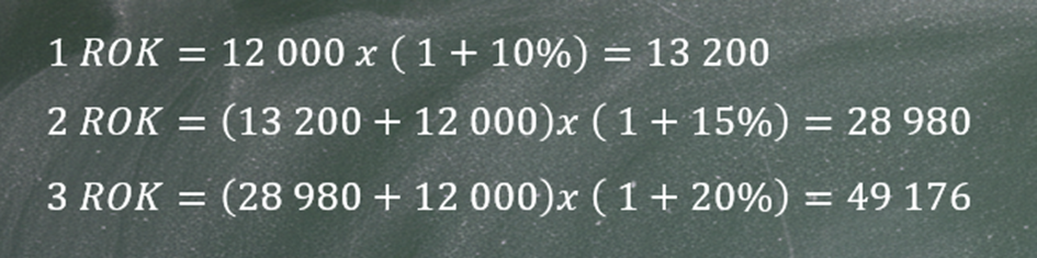 Załóżmy, że przez 3 lata inwestujemy po 12 000 rocznie. W pierwszym roku osiągamy stopę zwrotu na poziomie 10%, w drugim 15%, a w trzecim 20%.