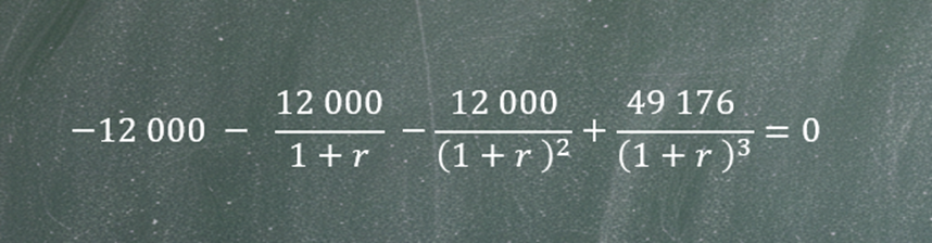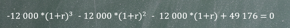 Następnie musimy znaleźć jedną średnią stopę zwrotu dla całego okresu. Zamiast używać trzech różnych wartości — 10%, 15% i 20% — szukamy jednej stopy, która przy takich samych wpłatach (12 000 rocznie) pozwoli uzyskać końcową kwotę 49 176.