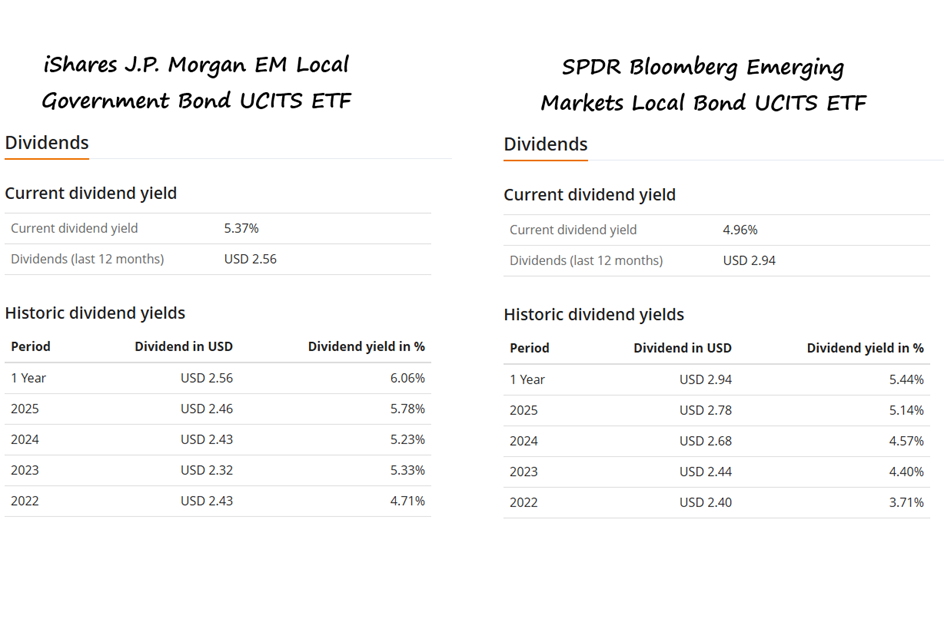 Wychodzi nawet na to, że iShares J.P. Morgan USD Emerging Markets Bond w ciągu ostatnich 5 lat generował wyższe odsetki niż J.P. Morgan EM Local Government Bond czy SPDR Bloomberg Emerging Markets Local Bond, czyli ETF-y na obligacje w lokalnych walutach. Jest to zapewne efekt wciąż wysokich stóp procentowych w Stanach Zjednoczonych.