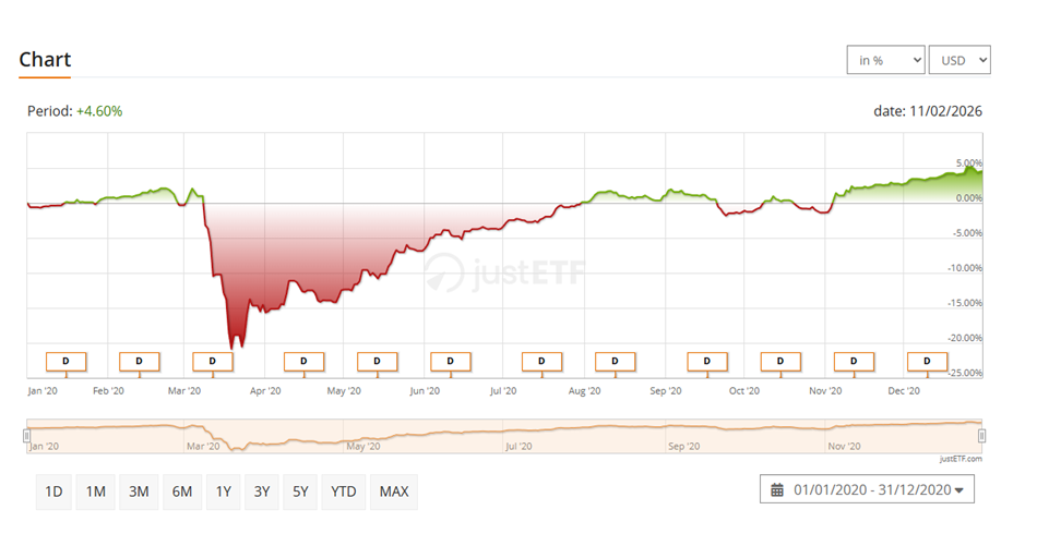 Dzięki analizie wersji dystrybucyjnej iShares J.P. Morgan USD Emerging Markets Bond UCITS ETF możemy stwierdzić, że tego typu fundusze są w stanie obronnie przejść przez kryzysowe okresy. Jego sumaryczna stopa zwrotu wynosi 139%, co daje średnioroczny wynik na poziomie niemal 5%.