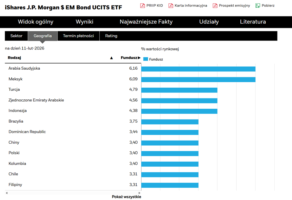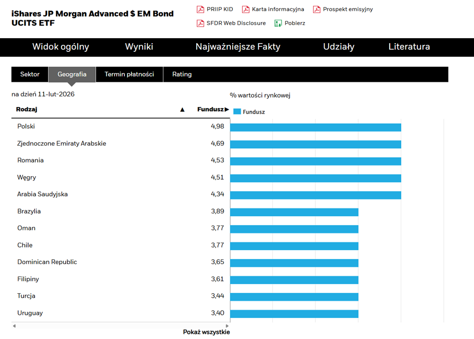 W iShares JP Morgan Advanced USD EM Bond UCITS ETF udział Polski wynosi 4,98%, a w iShares J.P. Morgan USD EM Bond UCITS ETF 3,40%.
