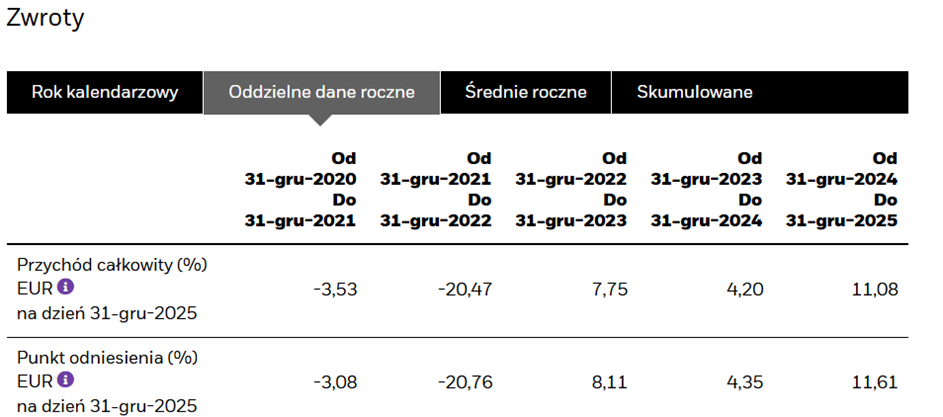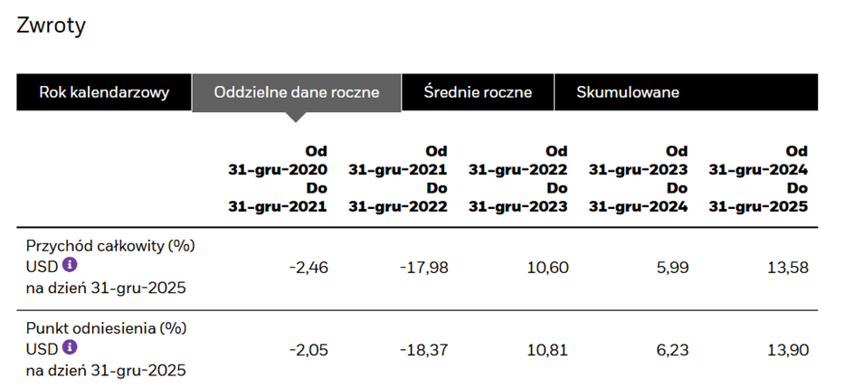 Lata 2023–2026 to odwrót sytuacji – stopniowy spadek stóp procentowych sprawił, że ETF zaczął zyskiwać na wartości.