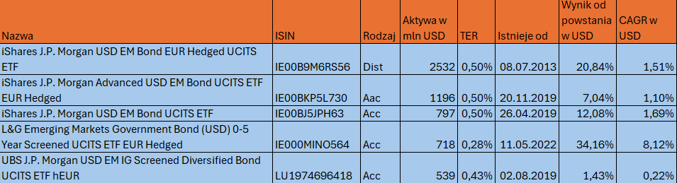Rezultaty nie powalają. Najwyższą średnioroczną stopę zwrotu ma L&G Emerging Markets Government Bond (USD) 0-5 Year Screened UCITS ETF EUR Hedged. Jest to ETF na obligacje denominowane w USD z terminem zapadalności do 5 lat.