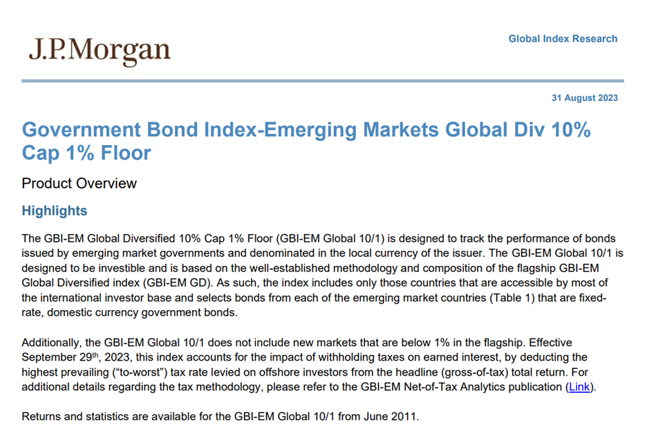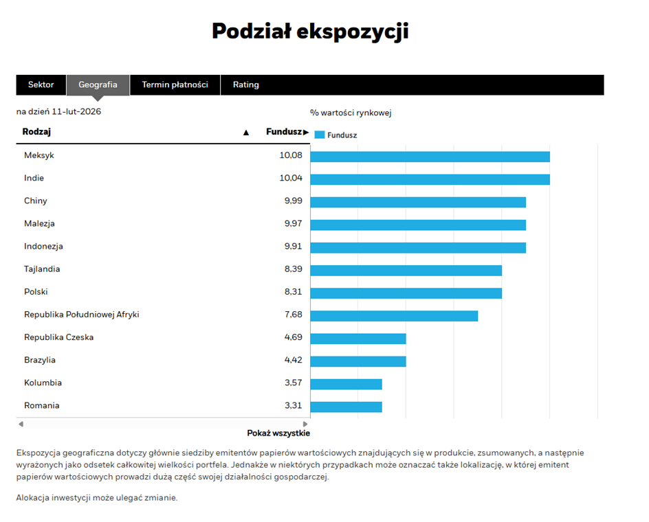 ETF odwzorowuje indeks „JP Morgan EMBI Global Diversified 10% Cap 1% Floor”, który z kolei uwzględnia wyłącznie papiery notowane w lokalnej walucie danego kraju. Nie ma więc tutaj na przykład obligacji denominowanych w dolarach. O takich przypadkach napiszę dalej. Tutaj mamy jasne zasady — jeżeli jest to obligacja z Meksyku, to jest to meksykańskie peso, jeżeli z Polski — polski złoty.
