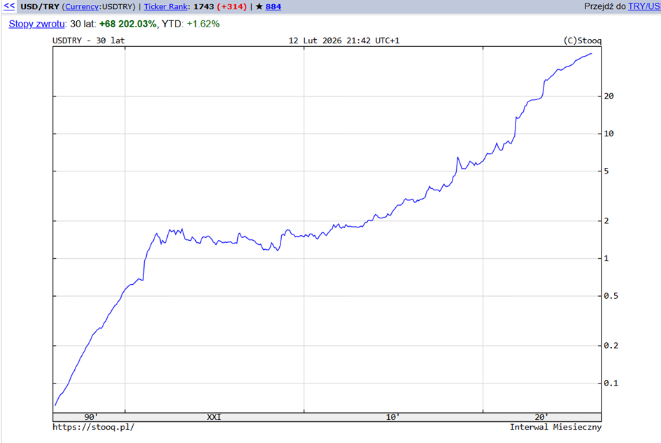 Wykres tureckiej liry za ostatnie 30 lat zanotował spektakularny spadek, liczony w tysiącach procent.