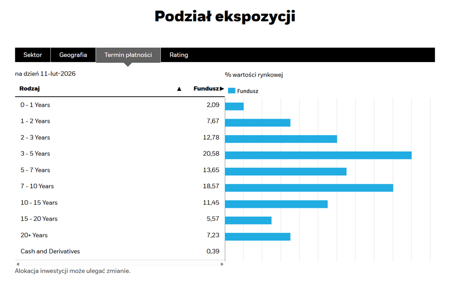 Podobnie jak ETF-y różnią się składem krajów, tak różnią się też średnim okresem zapadalności. Poniżej zamieszczam przykładowy rozkład obligacji na dzień 11 lutego 2026 roku dla iShares J.P. Morgan EM Local Govt Bond (IE00B5M4WH52). Średni termin do wykupu wynosi w ich przypadku około 8 lat, co nie jest wartością wyjątkowo dużą.