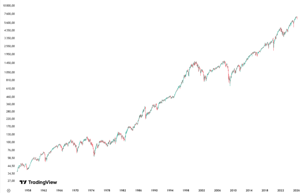 Patrząc na największe światowe indeksy giełdowe, takie jak S&P500 czy MSCI World, wyraźnie widać, że w długim terminie rosną, choć nie jest to linia prosta. S&P500, czyli indeks 500 największych spółek z amerykańskiej giełdy, od swojego powstania w 1957 roku rósł średnio o 10%-10,5%. Historycznie to właśnie dzięki akcjom powinieneś w długim horyzoncie czasowym pokonywać inflację. Szacuje się, że S&P500 średnio pokonywał ją o około 6,5%-7% rocznie.
