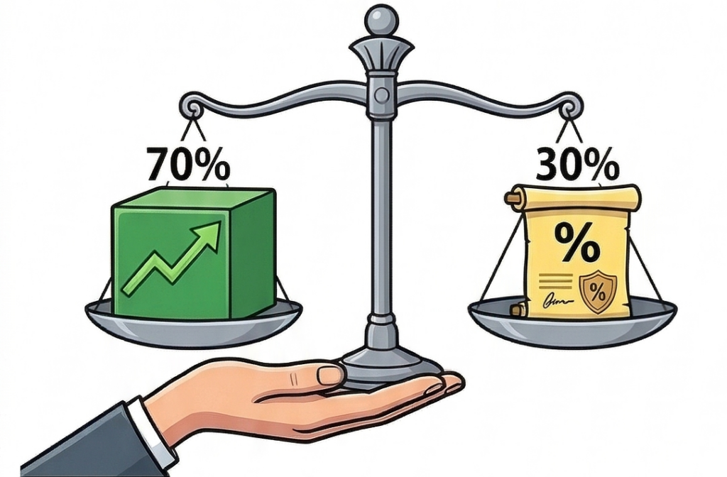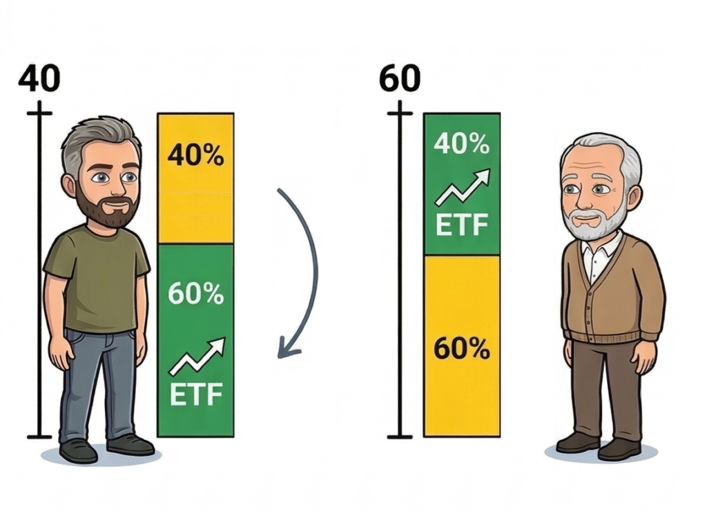 Popularna jest reguła „100 – Wiek”. Zgodnie z nią, udział akcji to dokładnie 100 minus Twój wiek (czyli 40-latek powinien posiadać 60% akcji, a 60-latek 40%).